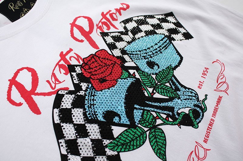 Te presentamos nuestra boutique para que vistas de lo más Cool en tu día a día como tu por ello aquí tienes la camiseta Lavinia de Rusty Pistons con estampado de silicona en relieve y pedrería